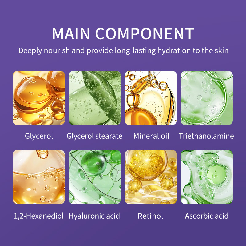 Vitamin C, Hyaluronic Acid, Retinol, Glycerol, Mineral Oil特徴 :
